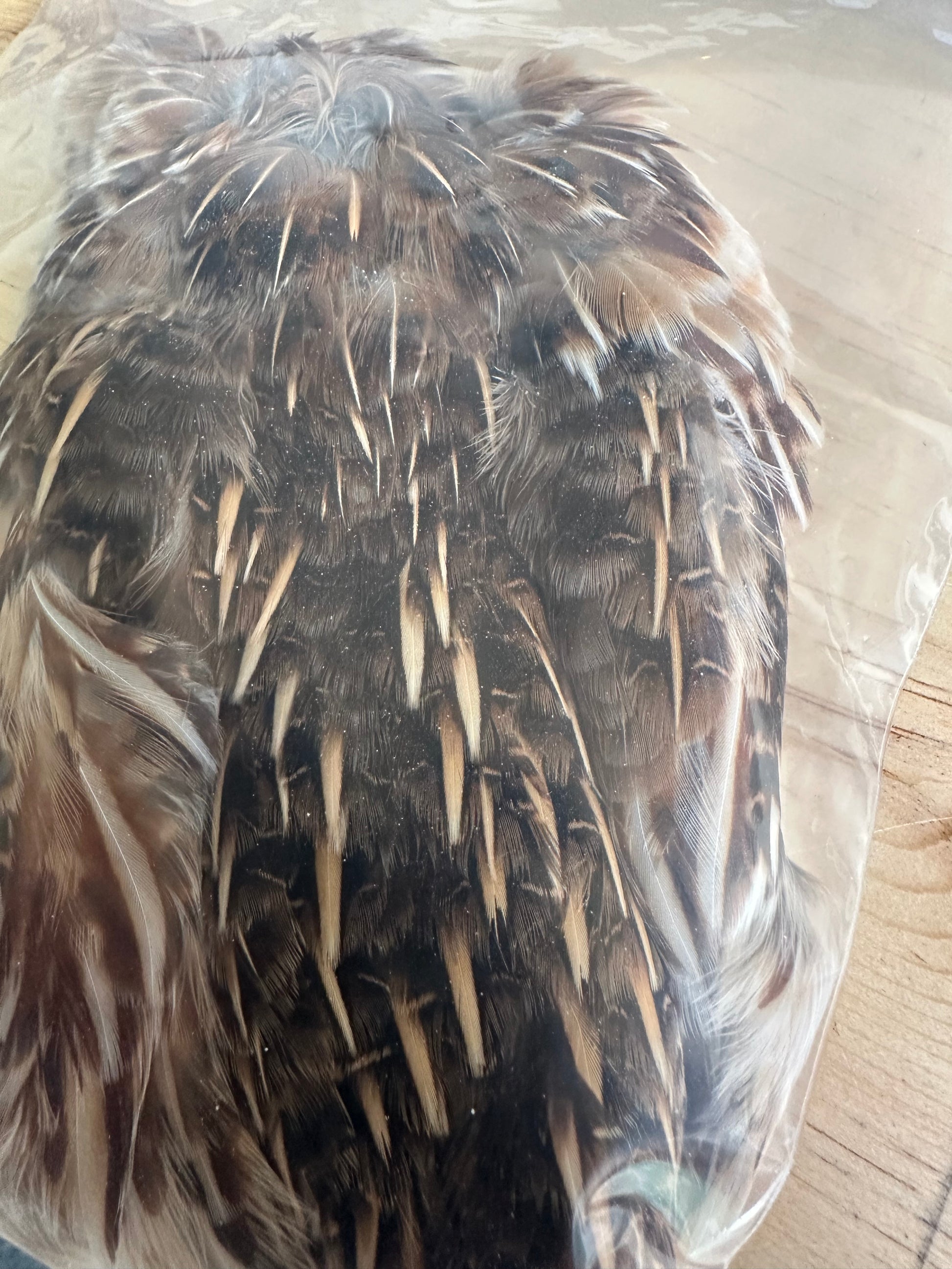 The coturnix quail is a soft webby feather that is an excellent and sometimes preferred feather for soft hackle over Hungarian partridge. This is the soft hackle collar that is commonly used on our famous Cartel Caddis pattern.