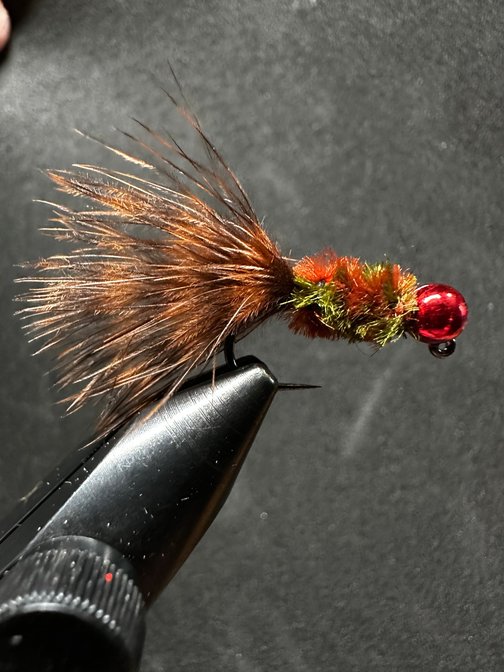 These are tied on #10 2x short KJ304 Kumoto with 3/16 tungsten beads. Designed to help the smaller midge above it get down into the column in higher water with the chance to also nab some fish!